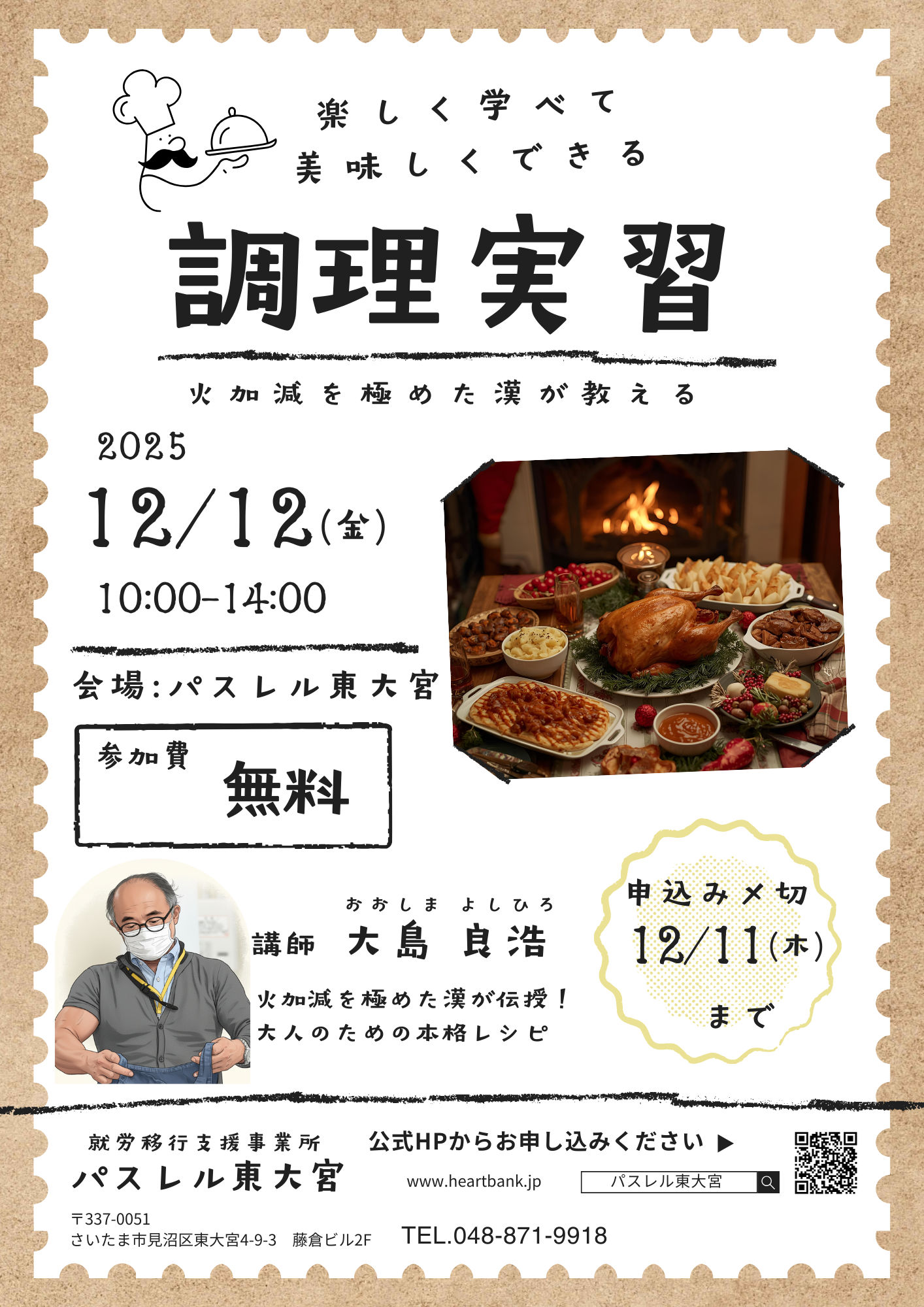 この度、訓練プログラムの一環として、以下の日程で調理実習を開催することになりました!